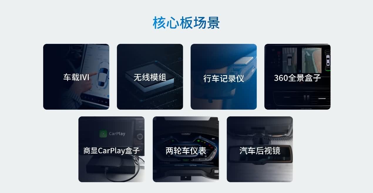 AC8257车联网模组应用场景普遍,可使用于车载IVI、无线模组、行车纪录仪、360全景盒子、商显CarPlay盒子、两轮车仪表和汽车后视镜等场景,助力汽车实现车机互联和车网互联。