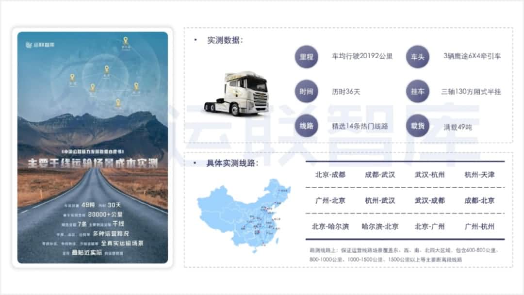 线路上,运联智库精选大票零担市场中的14条热门线路,举行满载实跑路测,运营线路场景笼罩东、西、南、北四大区域,包括中短途、远程等主要距离段线路。并团结中寰卫星运力数据平台给出的天下重卡运力大数据,比照剖析大票零担场景下的干线运力本钱结构,包管数据的真实合理性。